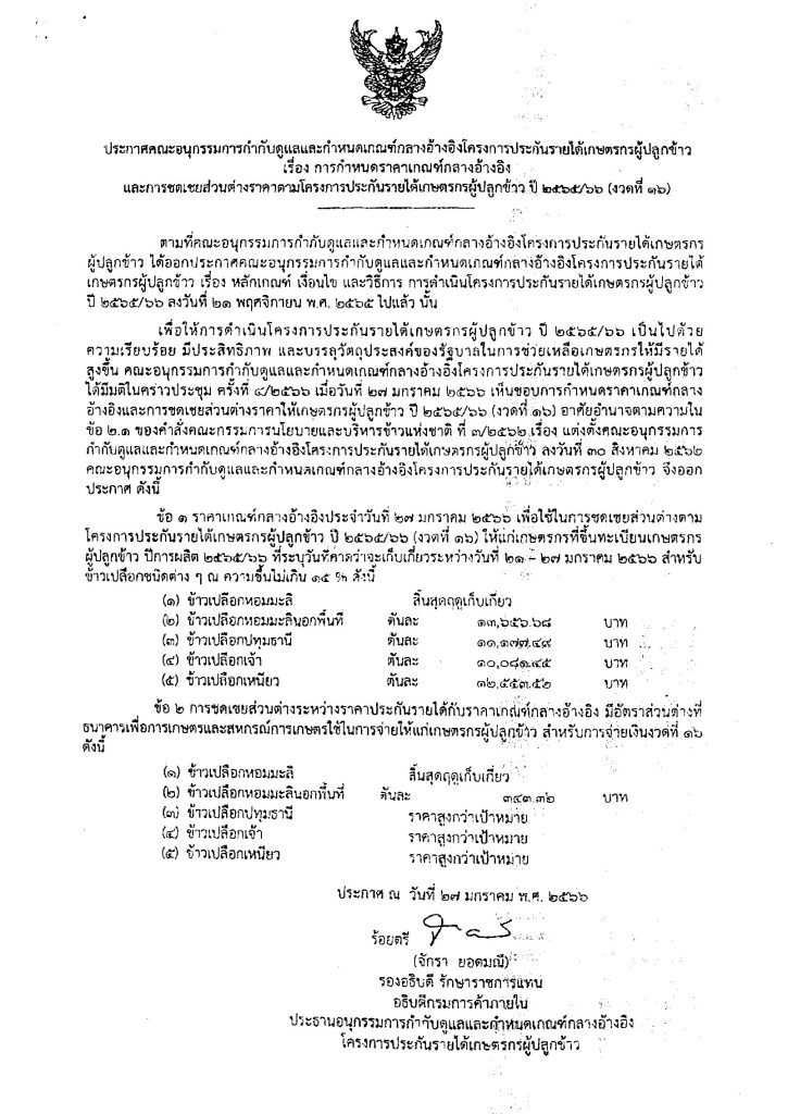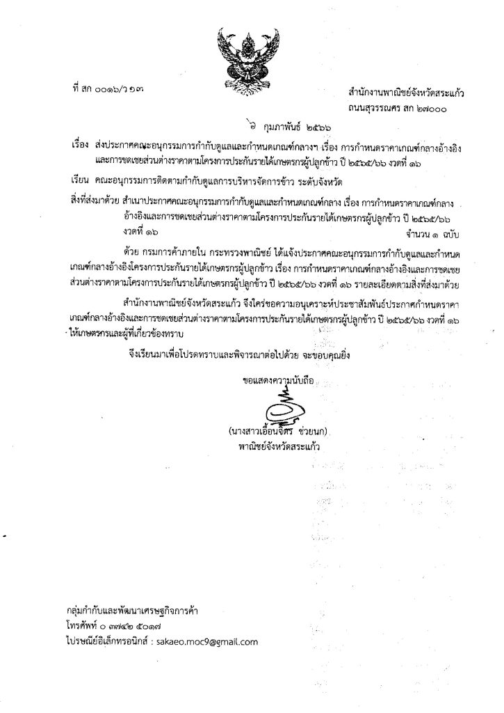 ข่าวฝากประชาสัมพันธ์ สำนักงานพาณิชย์จังหวัดสระแก้ว 7 กุมภาพันธ์ 2566 โดย admin / ข่าวประชาสัมพันธ์,ข่าวฝากประชาสัมพันธ์ การกำหนดราคาเกณฑ์กลางอ้างอิงและชดเชยส่วนต่างราคาตามโครงการประกันรายได้เกษตรกรผู้ปลูกข้าว ปี 2565/66 งวดที่ 16 FacebookFacebookXXLINELine